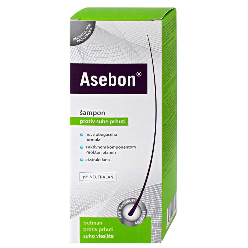 Asebon šampon protiv suhe prhuti namijenjen je za uklanjanje prhuti na suhom vlasištu. Sadrži ekstrakt lana, koji hidratizira te njeguje vlasište. Asebon šampon protiv suhe prhuti sa snažnom kombinacijom aktivnih tvari i vitaminskim kompleksom hrani kosu, djeluje umirujuće te učinkovito uklanja prhuti. Uz to aktivni sastojci značajno smanjuju mogućnost pucanja vrhova te garantiraju zdravu kosu i vlasište. Šampon je pH neutralan te ugodnog i blagog mirisa.