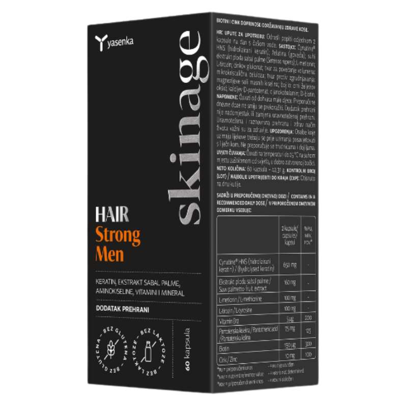 Yasenka Skinage HAIR Strong MEN je napredna klinički ispitana formula posebno prilagođena potrebama muškaraca koji se suočavaju s pojačanim ispadanjem kose, prorjeđenjem i stanjivanjem vlasi te gubitkom pigmenta.
