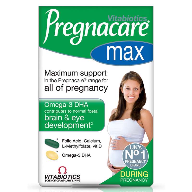 Pregnacare Max su vitamini i minerali za trudnice (u tabletama) i DHA omega-3 (u kapsulama). Ovo dvostruko pakiranje sadrži 56 multivitaminskih tableta i 28 kapsula molekularno destilirane omega-3 masne kiseline. Tablete, između ostalog, sadrže preporučenih 400 mcg folne kiseline (200 mcg kao L-metilfolat i 200 mcg pteroilmonoglutaminske kiseline), 10 mcg vitamina D3 te 500 mg kalcija. Kapsule sadrže 300 mg DHA i 60 mg EPA masne kiseline.